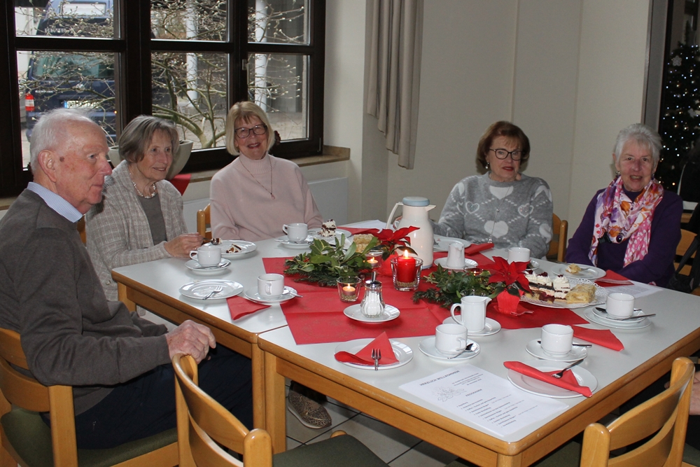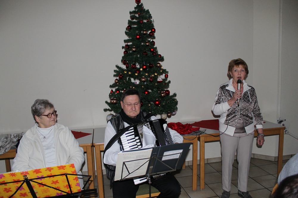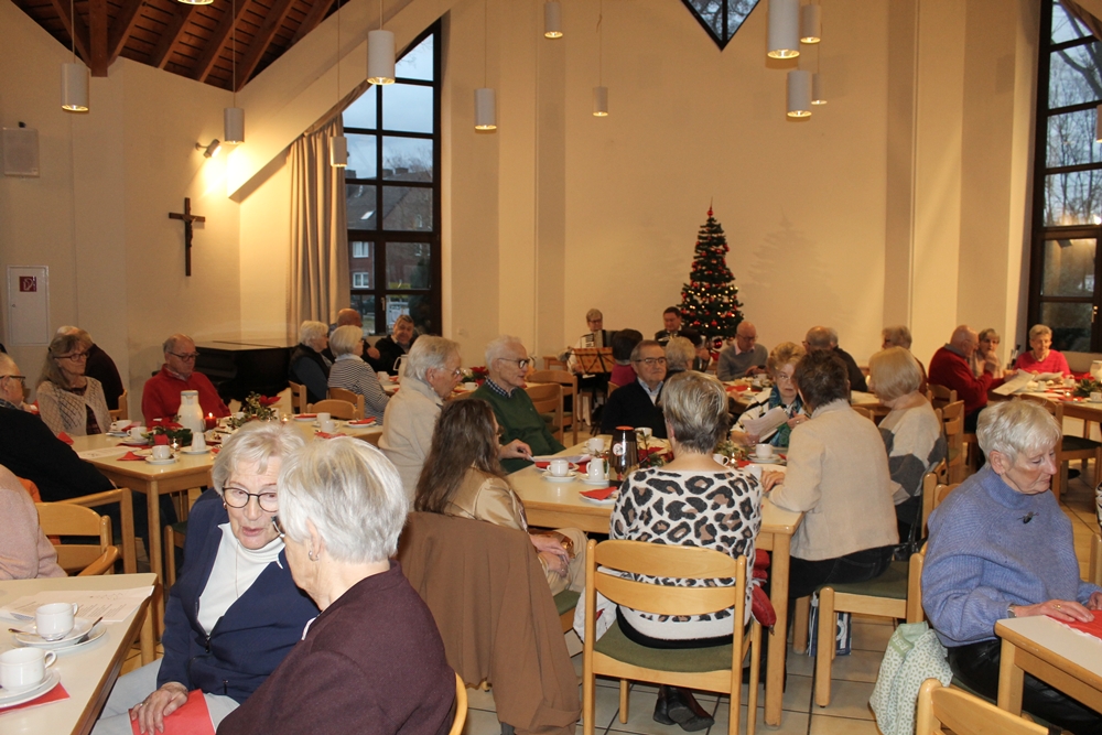 Soviel gesungen wurde noch nie! Beim diesjährigen traditionellen Adventkaffee der Seniorinnen und Senioren des TV Mengede im Gemeindesaal der katholischen Kirche – wie in jedem Jahr bei vollem Haus – kredenzte das begleitende Akkordeon-Paar Karin Menken und Ralf Oxe ein ausnahmslos deutsches Weihnachtslied-Potpourri, dessen Inhalt den meisten Gästen schon seit ihrer Jugendzeit bestens vertraut war. Damit aber auch alle Strophen in gleicher Inbrunst gesungen werden konnten, waren die Liedertexte in Gänze auf Ausdrucken greifbar ausgelegt worden. So hätte man sich mit den 70.000 Weihnachtlied-Sängerinnen und -Sängern im Dortmunder Westfalenstadion durchaus messen können. Und wenn die beiden fleißigen Akkordeonisten mal eine kurze Unterbrechung zum Wenden ihrer Notenblätter einlegten, waren es Bärbel Riedemann, Axel Kluge und Michael Bergediek, die mit Ihren nachdenklichen oder amüsanten Geschichten für nahtlose Übergänge sorgten.